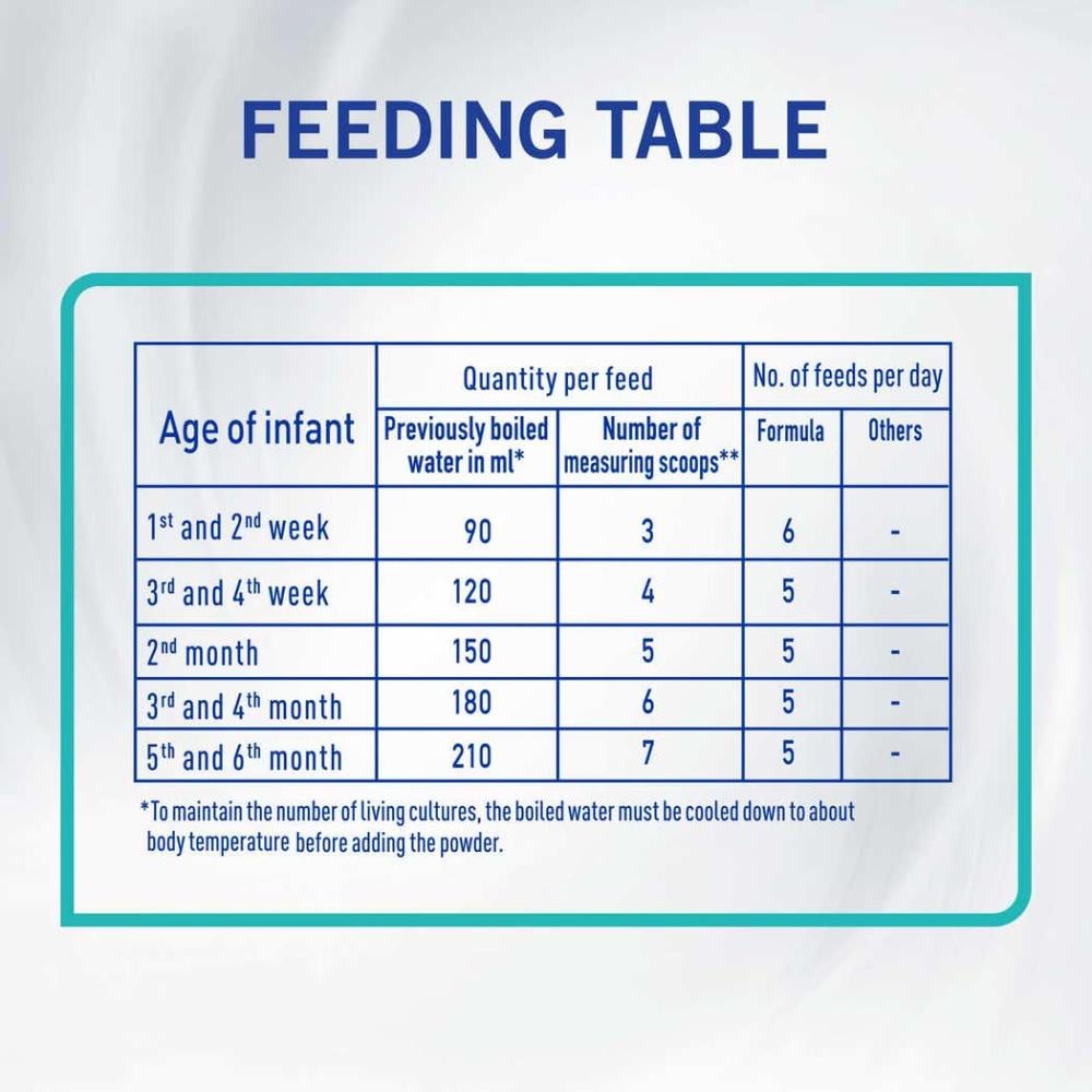 - أضيفي عدد المكاييل المقررة لعمره في جدول التغذية.
